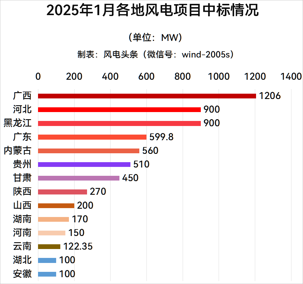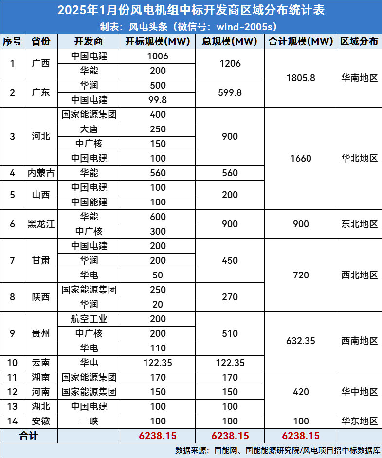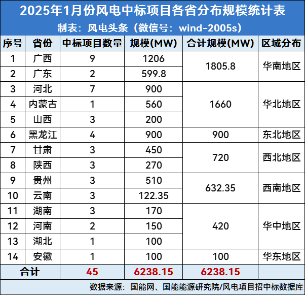 根据风电头条(微信号:wind-2005s)风电项目数据库统计,2025年1月份有14个省份风电项目进行开标,规模总计6238.15MW。