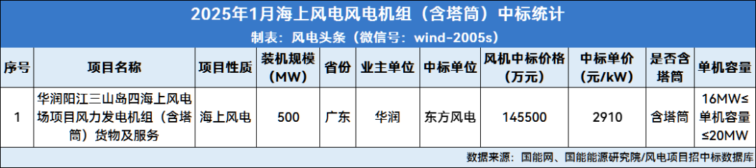根据风电头条(微信号:wind-2005s)风电项目数据库统计显示,1月份,含塔筒的海上风电项目总计1个,规模为500MW。