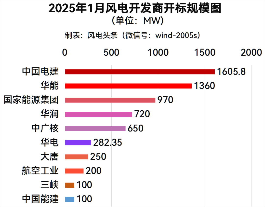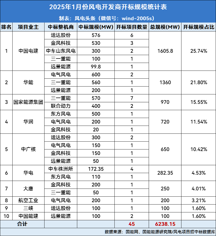根据风电头条(微信号:wind-2005s)梳理,2025年1月份共有10家央企开发商发布风电机组开标结果,分别是中国电建、华能、国家能源集团、华润、中广核、华电、大唐、航空工业、三峡、中国能建。