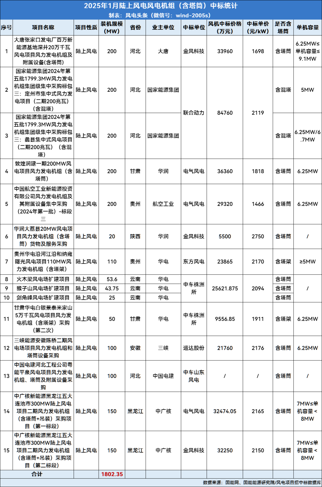 根据风电头条(微信号:wind-2005s)风电项目数据库统计显示,1月份,含塔筒的陆上风电项目总计15个,规模为1802.35MW,项目中标均价为2047元/kW。