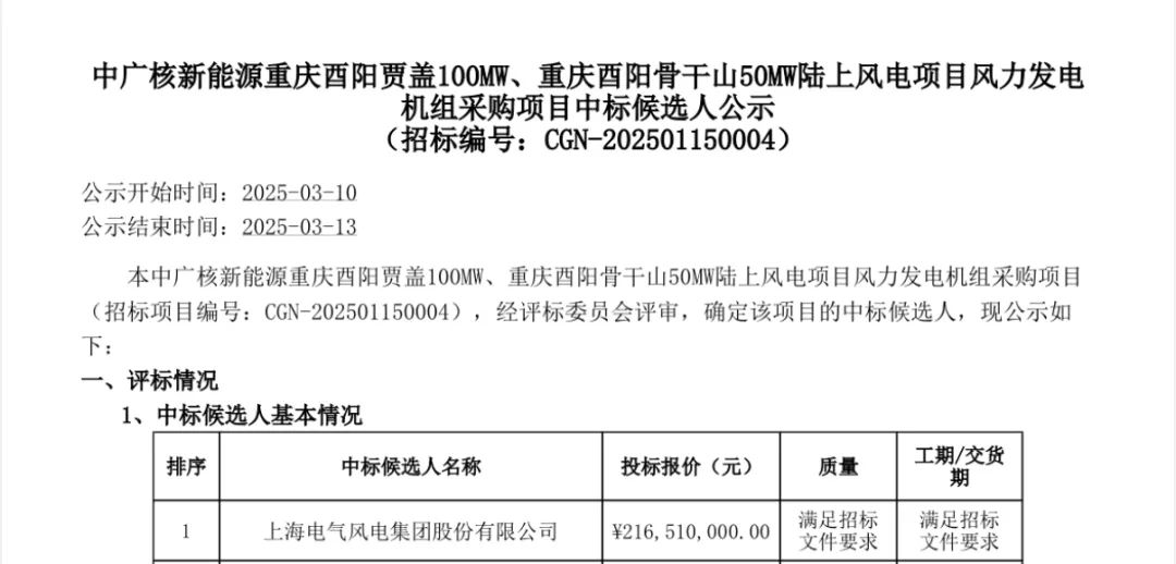 中广核新能源重庆酉阳贾盖100MW、重庆酉阳骨干山50MW陆上风电项目风力发电机组采购项目发布中标候选人公示,显示电气风电成功中标。
