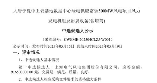5月15日,大唐宁夏中卫云基地数据中心绿电供应常乐500MW风电项目公开招标结果公告,电气风电成功中标该项目,将为其提供75台陆上卓越平台机组,双方在风电领域的合作得以持续拓展与加深。