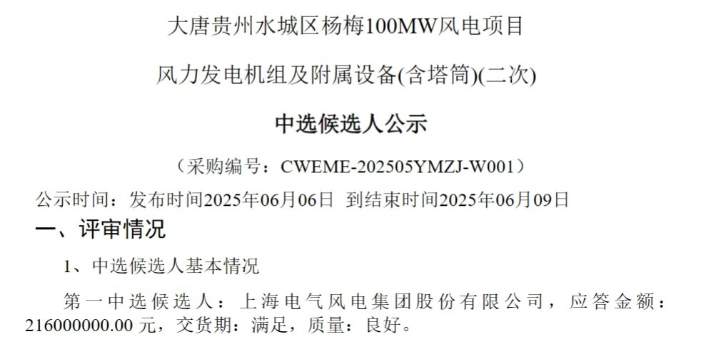 近日,大唐贵州水城区杨梅100MW风电项目二次招标公开招标结果公告,电气风电成功中标该项目,将为其提供陆上卓越平台机组,双方在风电领域的合作得以持续拓展与加深。