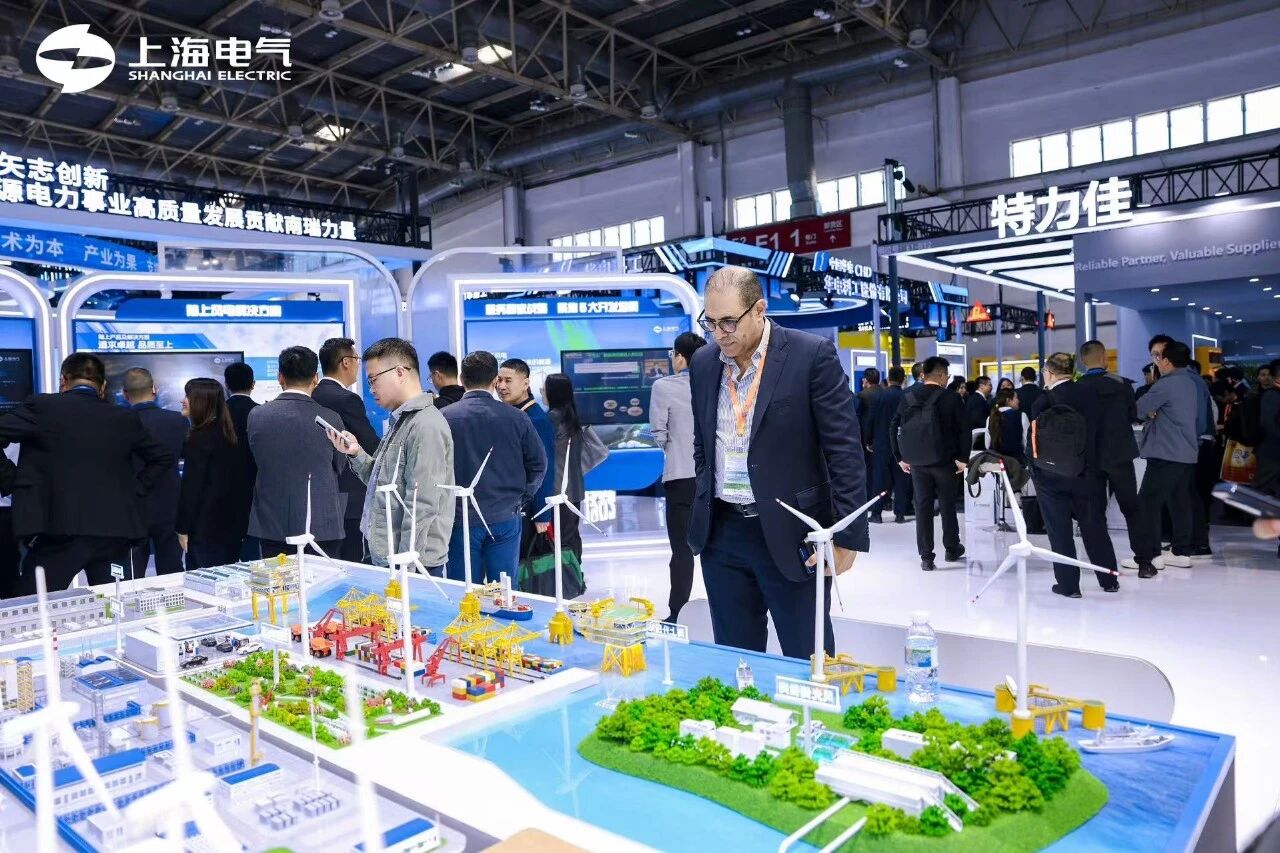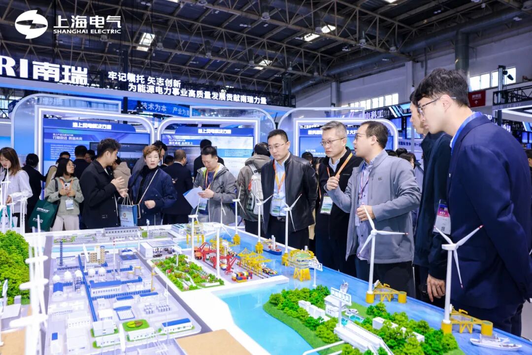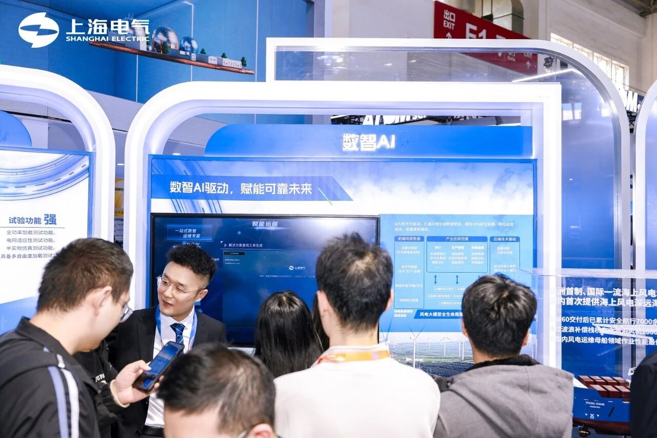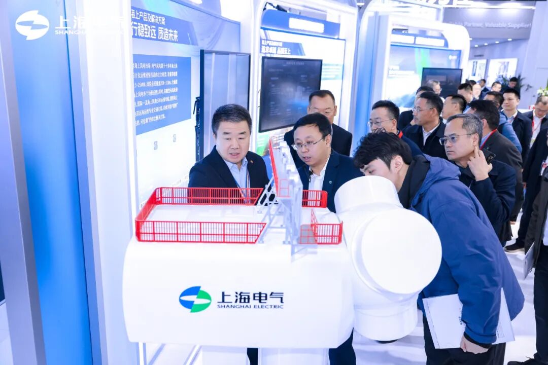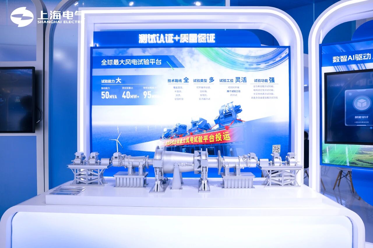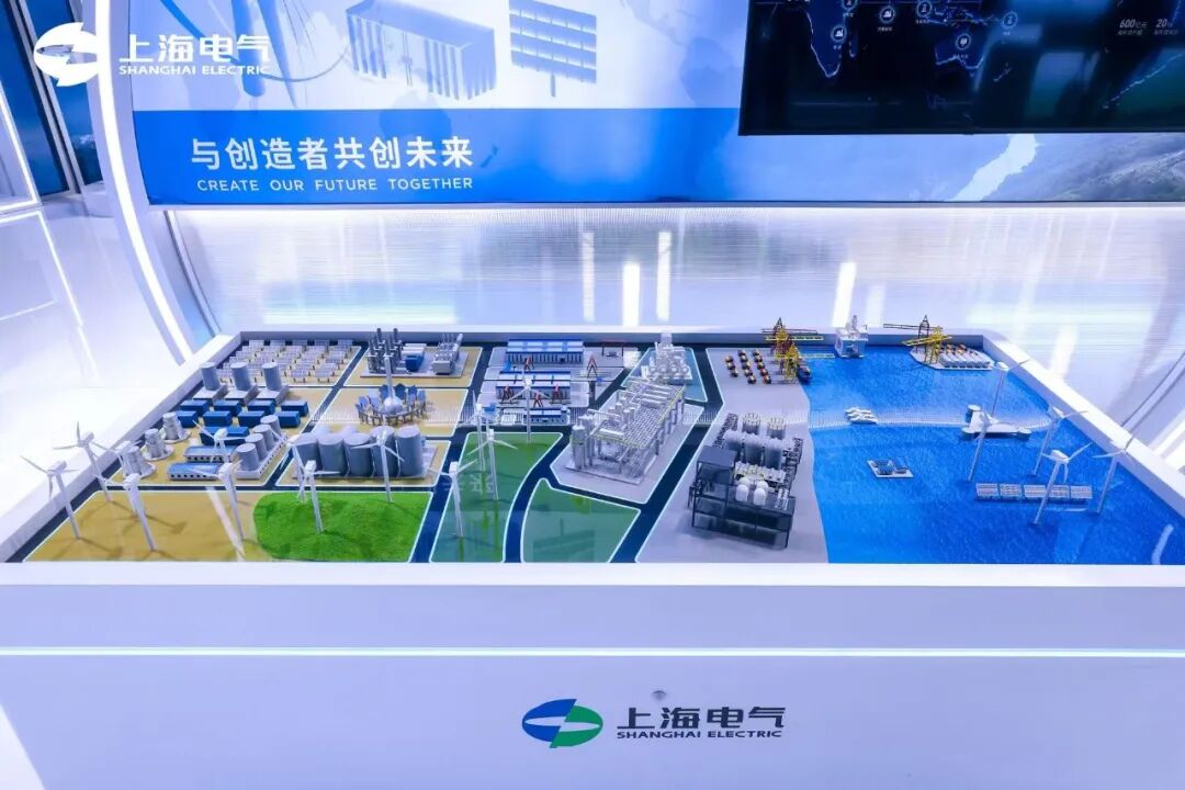 展台上的“WIND TO X POWER TO FUTURE” 中心展项,集中展示了中国首批绿电制氢就地消纳示范项目——上海电气洮南市风电耦合生物质绿色甲醇一体化示范项目、全球首个漂浮式风渔融合示范项目、深远海制氢示范项目及万里长江首个“零碳岛”等标杆示范案例,展示了上海电气在新能源全产业链的系统集成能力和创新实力。