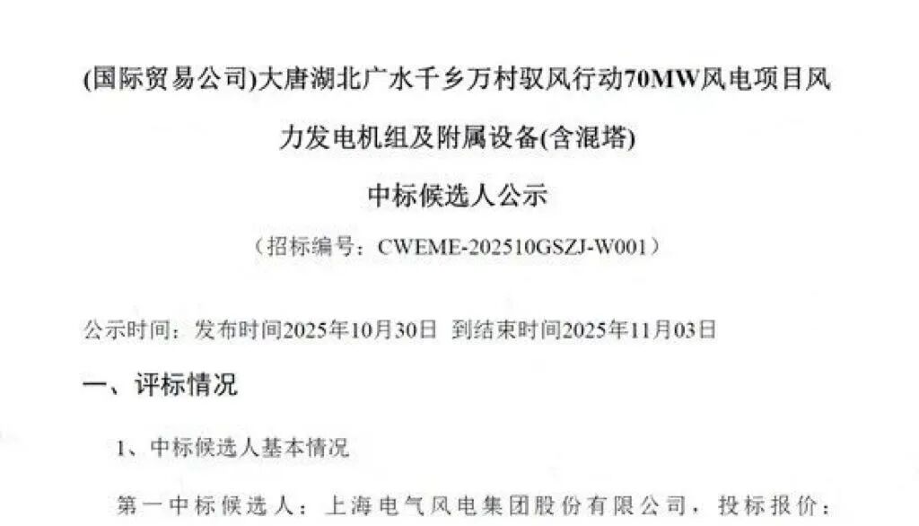 近日,大唐湖北广水千乡万村驭风行动70MW风电项目风力发电机组及附属设备公开招标结果公告,显示电气风电成功中标该项目,将为其提供12台陆上卓越平台机组,双方在风电领域的合作得以持续拓展与加深。