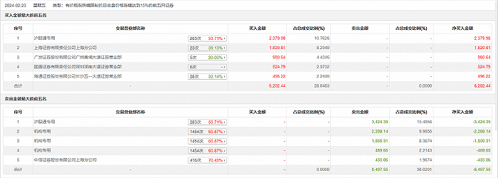 具体来看,机构合计净卖出4548.09万元。此外,沪股通专用、上海证券上海分公司分别买入2379.98万元、1820.81万元;沪股通专用、中信证券上海分公司分别卖出3424.39万元、435.06万元。