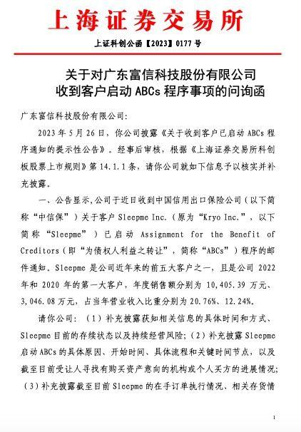 5月29日,广东富信科技股份有限公司(以下简称“富信科技”或“公司”)收到上海证券交易所关于对客户启动ABCs程序事项的问询函。问询函要求富信科技补充披露获知相关信息的具体时间和方式、Sleepme目前的存续状态以及持续经营风险;补充披露Sleepme启动ABCs的具体原因、开始时间、具体流程和关键时间节点,以及截至目前受让人寻找有购买资产意向的机构或个人买方的进展情况等。