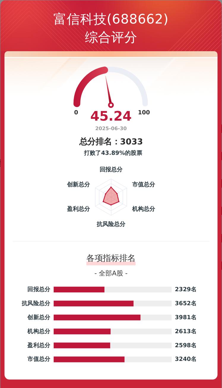 富信科技在多个评估维度上的表现如下:回报维度得分为8.73分,反映其股东回报能力;创新维度得分4.82分;盈利维度得分9.85分;抗风险维度得分6.87分;机构维度得分8.92分;市值维度得分6.05分。这些分数综合反映了公司在不同方面的实力和潜力。