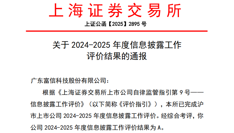 近日,上海证券交易所发布《沪市上市公司2024至2025年度信息披露工作评价结果》。广东富信科技股份有限公司(股票代码:688662.SH)凭借规范、透明、高效的信息披露实践,获得信息披露工作的最高考核评级——A级。这也是公司自2021年上市以来,首次获得A级信息披露考核评价。
