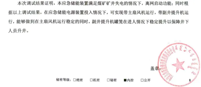 2024年4月18日,现场进行了一次系统断电矿井离网应急测试,本次测试结果证明,应急储能装置满足煤矿矿井失电的情况下,离网启动功能;同时根据以上调试结果,在应急储能电源装置投入情况下,可实现主扇风机启动运行,副井提升机启动运行,能够做到在主扇风机运行稳定的同时,副井提升机罐笼在进人情况下稳定提升,以保障井下人员升井。