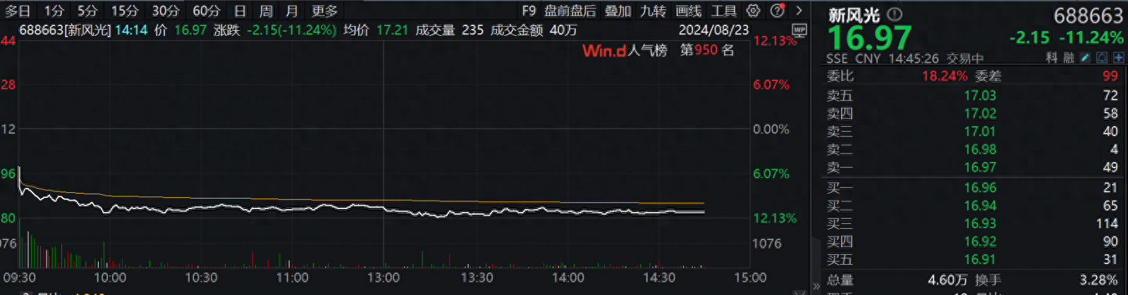 8月23日,新风光(688663.SH)跳空低开,盘中跌幅超过11%。公司8月22日晚发布2024年度半年报,报告期内实现营业总收入7.00亿元,同比增长9.46%;实现归母净利润7581.20万元,同比下降2.95%。
