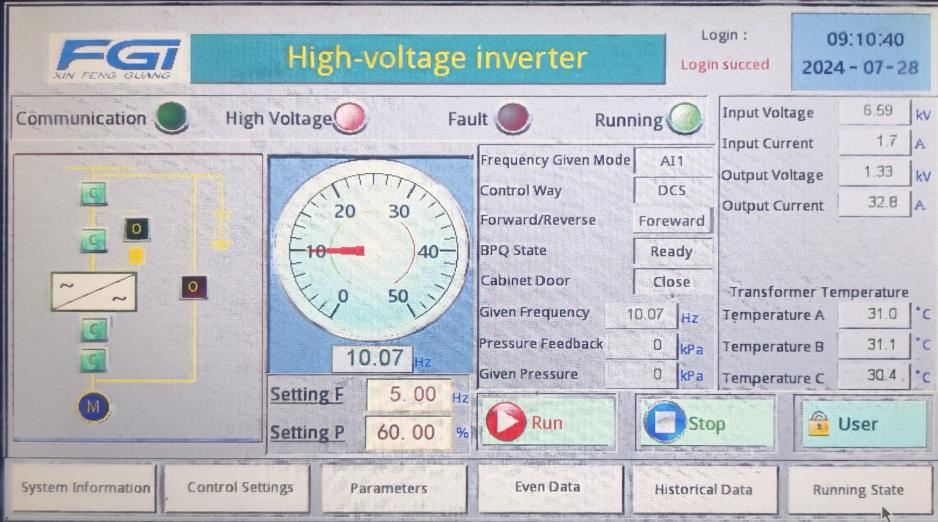 业主首次接触高压变频器设备,带电机、带载、匹配工艺运行平稳,调试送电一次成功。
