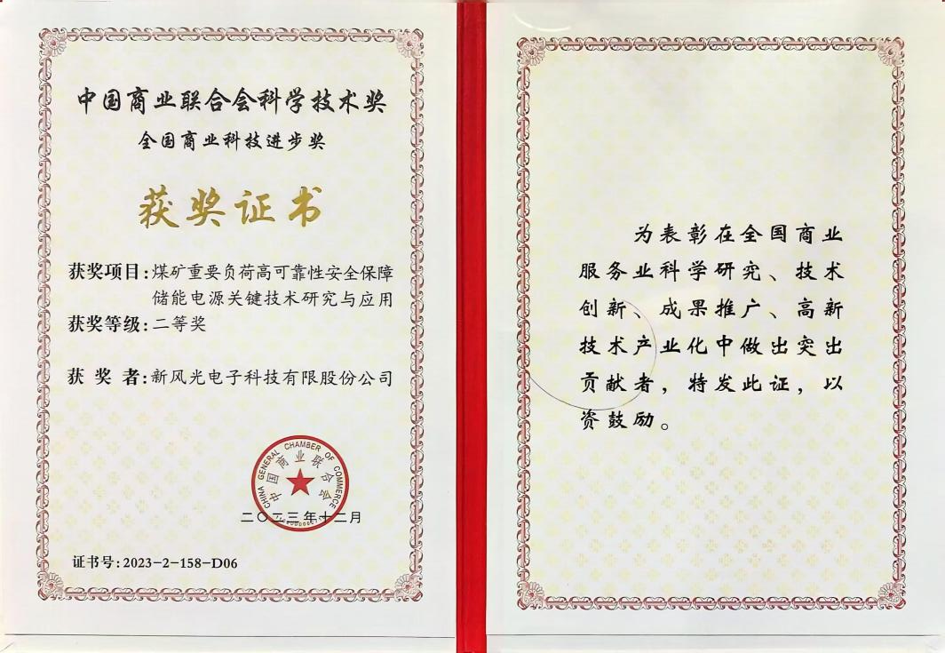 近日,新风光收到中国商业联合会颁布的,2023年度科学技术奖的获奖证书。新风光电子科技股份有限公司凭借其在技术创新和产品研发方面的卓越表现,成功荣获该奖项。这一荣誉不仅彰显了新风光在“储能+矿山安全”领域的领先实力,也标志着公司在推动科技进步和产业升级方面做出了重要贡献。