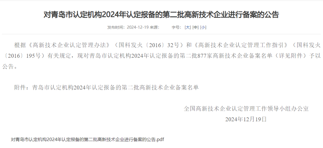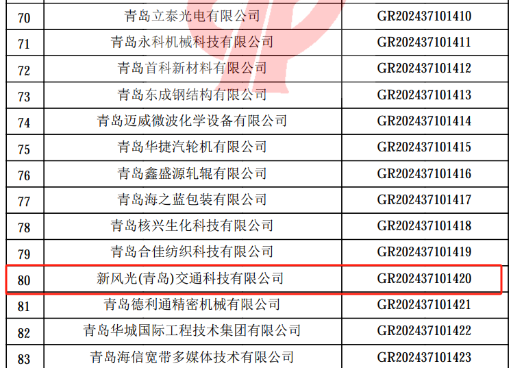12月19日,全国高新技术企业认定管理工作领导小组根据《高新技术企业认定管理办法》和《高新技术企业认定管理工作指引》有关规定,经企业申报、区市推荐、青岛市认定机构审核等程序,认定新风光(青岛)交通科技有限公司为国家级高新技术企业。