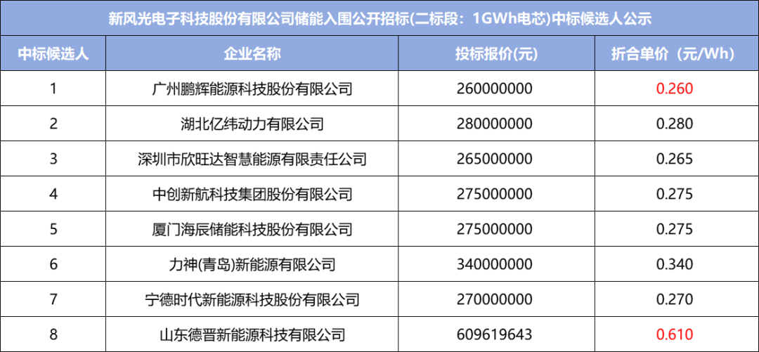 该标段共有9家企业入围,包括鹏辉能源、亿纬动力、欣旺达、中创新航、海辰储能、力神新能源、宁德时代、德晋新能源、瑞源电气。