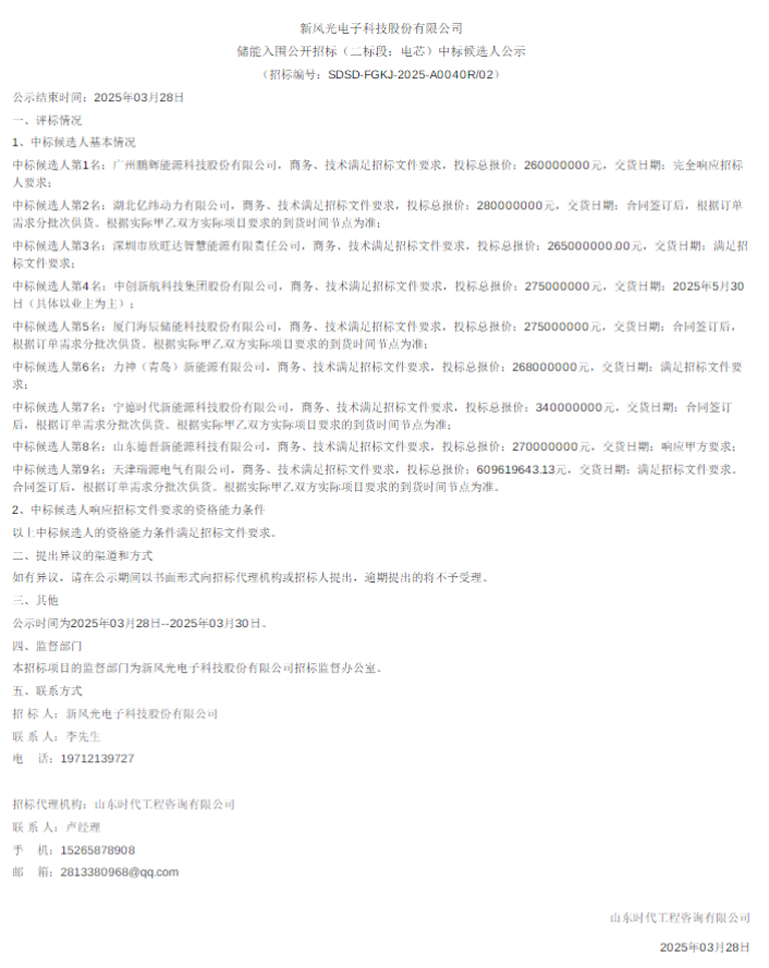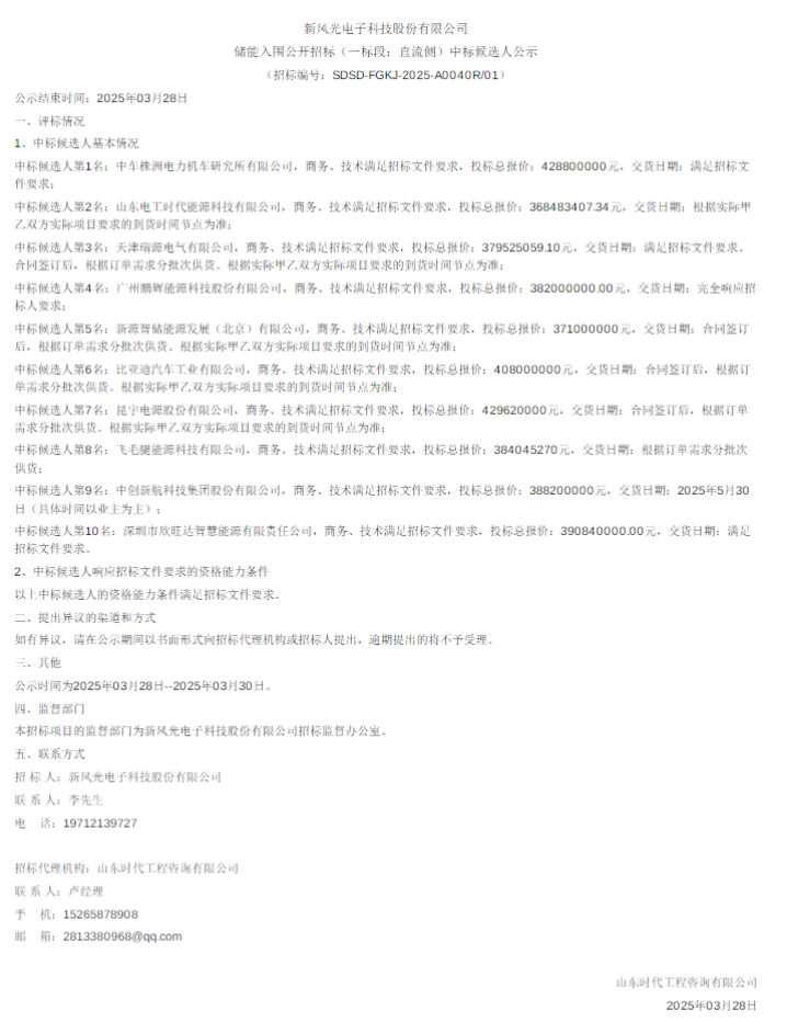 3月28日,新风光电子科技股份有限公司储能入围公开招标(一标段:直流侧)及(二标段:电芯)中标候选人公示。
