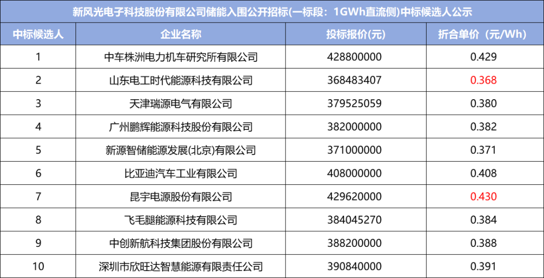 该标段共有10家企业入围,包括中车株洲所、山东电工时代、瑞源电气、鹏辉能源、新源智储、比亚迪、昆宇电源、飞毛腿、中创新航、欣旺达。此次储能系统报价在0.368~0.43元/Wh之间,其中7家企业储能系统单价低于0.4元/Wh。
