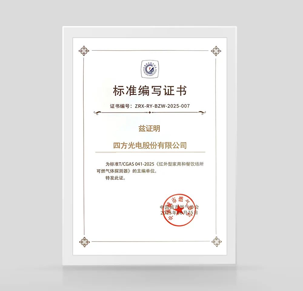 2025年6月26日,我国首个针对家用和餐饮场所红外燃气探测器的技术标准《红外型家用和餐饮场所燃气探测器》(T/CGAS 041-2025)正式发布。该标准由中国城市燃气协会批准,四方光电股份有限公司主编。