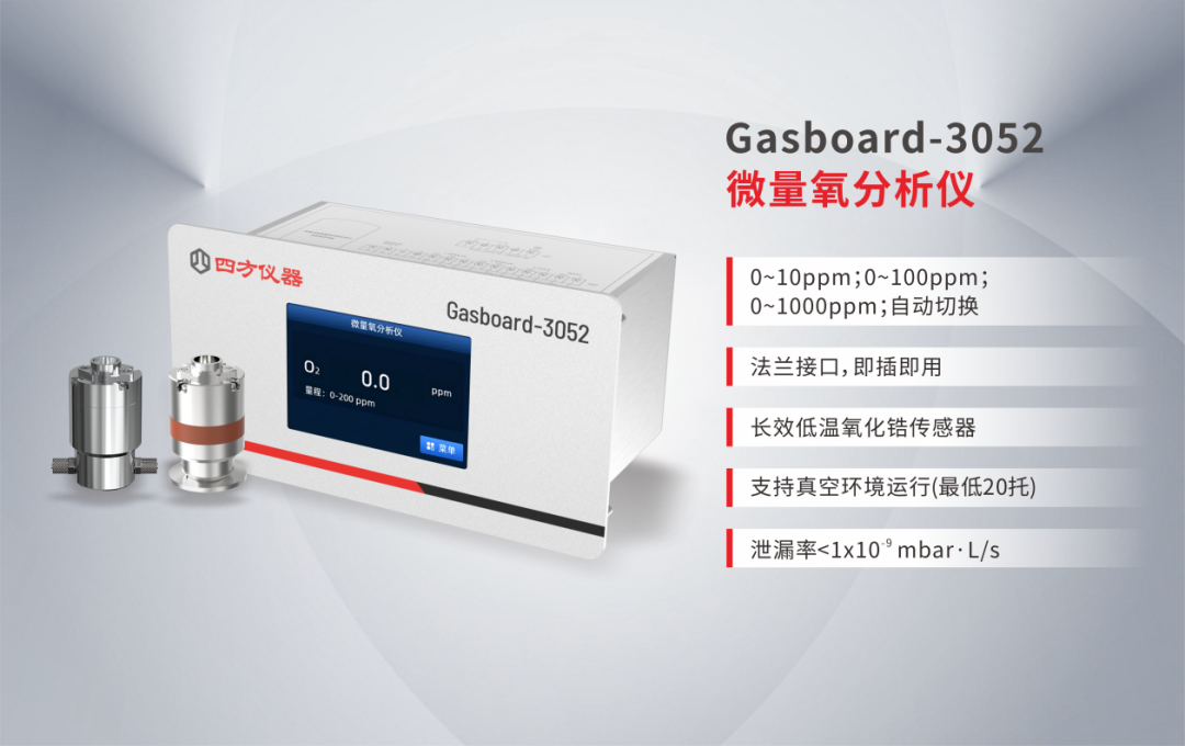 四方光电自主研发的 Gasboard-3050系列低浓度氧气分析仪,最低分辨率达0.1 ppm,量程覆盖0–10 ppm至100% O?,搭载经现场长期验证的氧化锆传感器,具备优异的再现性与高速响应特性,能对工艺气体及设备腔室中的氧含量进行精准监测,从而有效帮助客户从源头控制氧污染,为提升产品良率提供可靠保障。