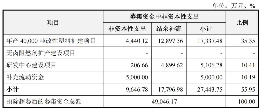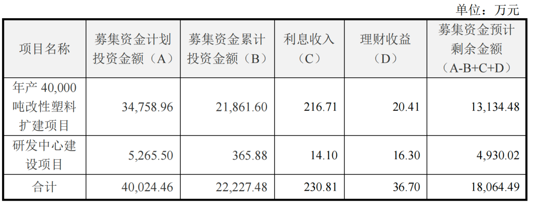 另外两个项目,改性塑料项目和研发中心项目在2022年3月达到可使用状态,但实际达产情况不及预期,聚石化学将上述两个募投项目结项,并将节余募集资金1.81亿元用于永久补充流动资金。