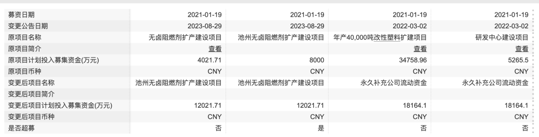 招股书披露,聚石化学IPO募资主要用于年产4万吨改性塑料扩建项目(简称:改性塑料项目)、无卤阻燃剂扩产建设项目(简称:无卤阻燃剂项目)、研发中心建设项目(简称:研发中心项目)、池州聚苯乙烯生产建设项目(简称:池州聚苯乙烯项目)4个项目。不过2021月1月19日,资金全部到位后,聚石化学对项目实施和资金使用情况做了多项变更。