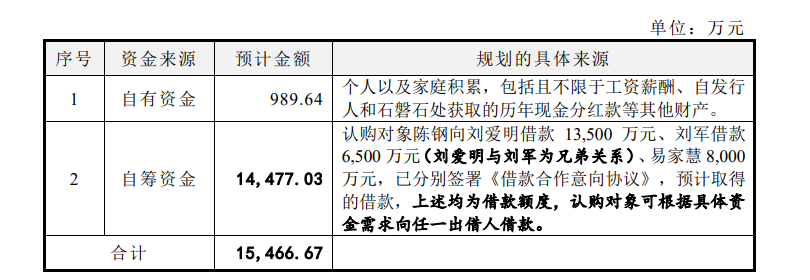 陈钢用于本次认购的资金主要分为两部分,一是多年以来积累的自有资金989.64万元,二是拟从老乡兼朋友刘爱明、刘军,以及朋友的子女易家慧处借款1.45亿元。