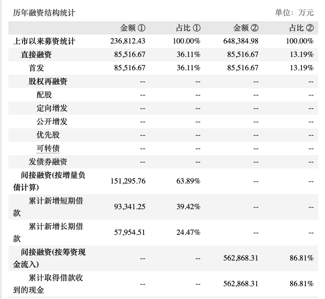 上市以来,累计募资(按筹资现金流入)金额64.84亿元,主要通过借款取得。2021年-2023年一季度,聚石化学有息负债金额分别为8.92亿元、11.67亿元、12.30亿元,主要为短期借款、长期借款,有息负债占负债总额的比例分别为46.64%、49.46%、53.25%。