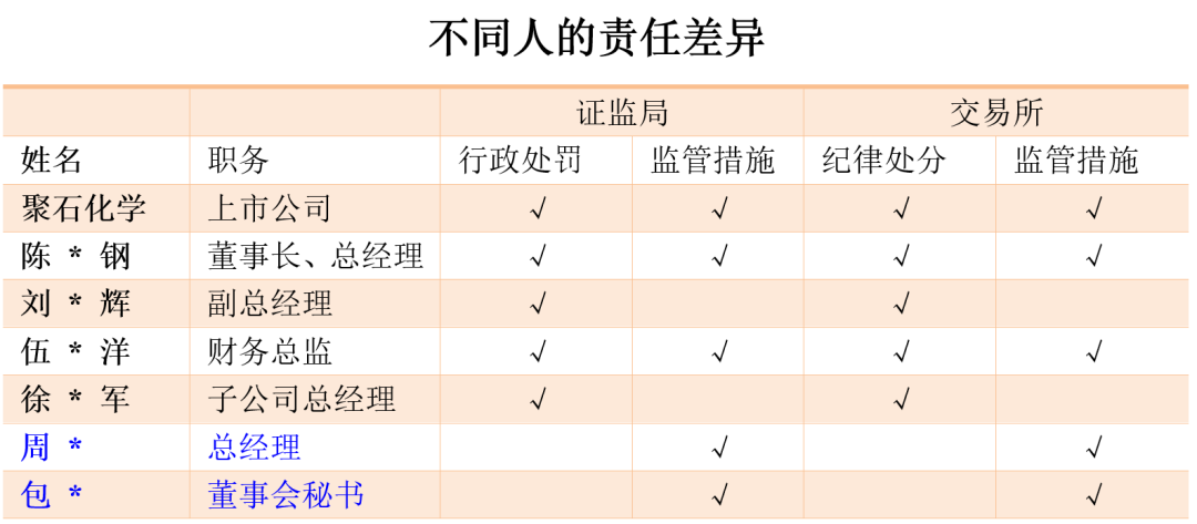 聚石化学涉案期间有关董事、高级管理人员涉嫌违反《证券法》第八十二条第三款规定,构成《证券法》第一百九十七条第二款所述“直接负责的主管人员”。其中,陈钢作为聚石化学时任董事长、总经理,全面负责聚石化学的经营管理工作,知悉聚石化学开展无商业实质贸易业务情况,未对涉案子公司进行有效管理;刘鹏辉作为聚石化学时任董事、副总经理,组织聚石化学相关人员开展无商业实质贸易业务;伍洋作为聚石化学时任董事、财务总监,负责公司整体财务工作,知悉公司为获取融资而开展无货物实际出入库贸易业务的情况,未采取进一步处理措施。陈钢、刘鹏辉、伍洋未勤勉尽责,在2023年半年度报告上签字保证所披露的信息真实、准确、完整,系聚石化学2023年半年报存在虚假记载的直接负责的主管人员。