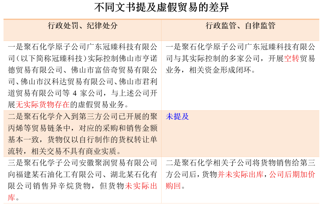 一是聚石化学原子公司广东冠臻科技有限公司(以下简称冠臻科技)实际控制佛山市亨诺德贸易有限公司、佛山市富倍奇贸易有限公司、佛山市汉科达贸易有限公司、佛山市君利道贸易有限公司等4家公司,与上述公司开展无实际货物存在的虚假贸易业务,对应虚增收入86,550,865.69元,虚增成本88,238,071.82元,虚减利润1,687,206.13元。