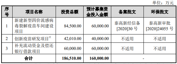 金迪克此前披露的招股书显示,公司原拟募资16亿元,分别用于“新建新型四价流感病毒裂解疫苗车间建设项目”、“创新疫苗研发项目”、“补充流动资金及偿还银行借款项目”。