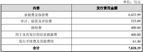 本次公司公开发行新股的发行费用合计7828.39万元,其中中信证券获得承销费及保荐费6433.99万元。