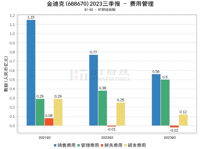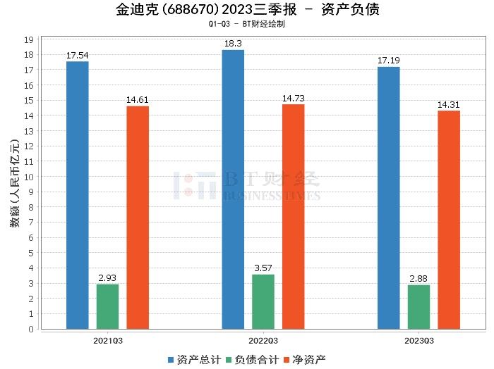 从资产负债方面来看,金迪克公司2023年三季度末的总资产为17.19亿元,相比上年度末的18.27亿元下降了5.89%。负债合计为2.88亿元,相比上年度末的3.67亿元减少了21.53%。净资产为14.31亿元,相比上年度末的14.6亿元减少了1.99%。资产负债率为16.76%,相比上年度末的20.1%减少了3.34个百分点。