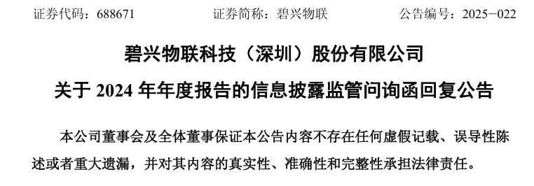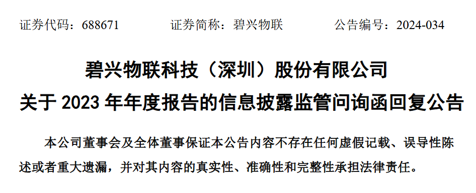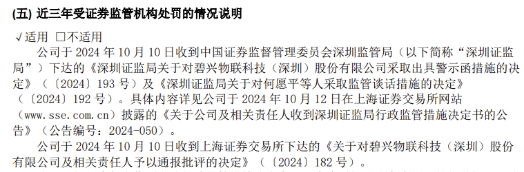 2024年10月10日,上市仅1年有余,碧兴物联及相关高管(公司董事长何愿平、时任总经理朱缨、财务总监王进、董事会秘书潘海瑭)便收到深圳证监局的行政监管措施决定书,公司收警示函,上述高管被监管谈话。同日,公司及相关高管收到上交所对公司及相关高管予以通报批评的决定。