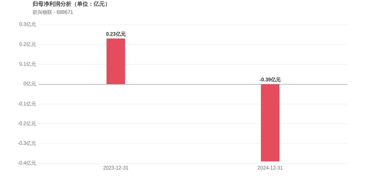 碧兴物联上市的2023年,当年实现归母净利润0.23亿元。截至最新完整财年的2024年,公司实现-0.39亿元的归母净利润,近年累计下降了264.92%。这2年间,碧兴物联有1年出现亏损。