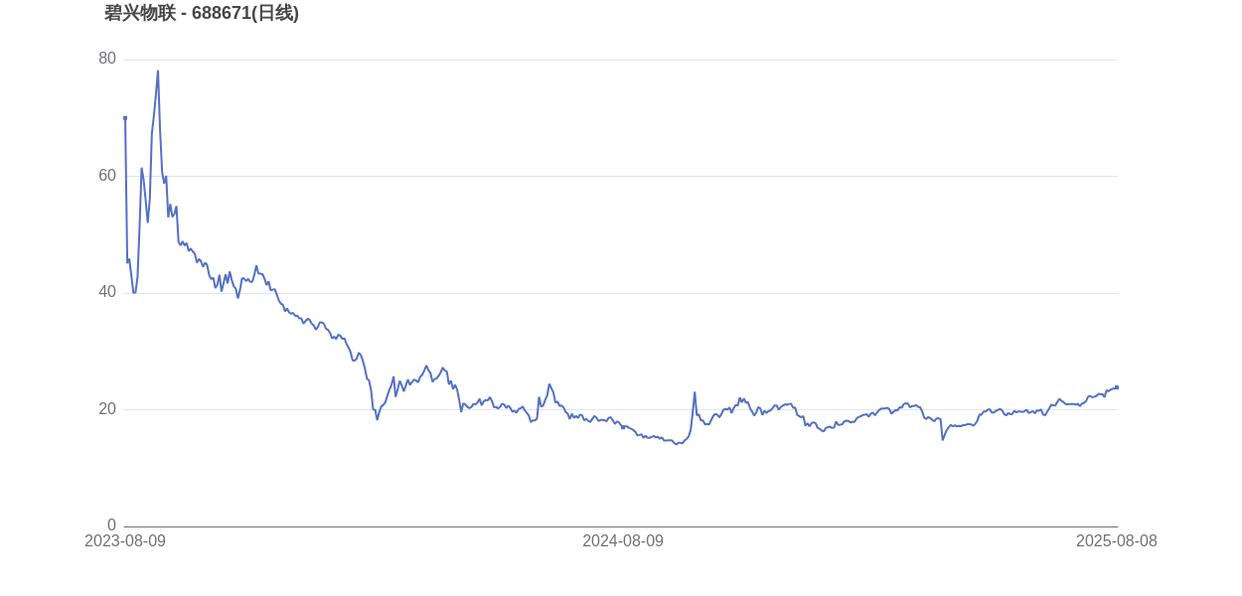 碧兴物联自2023年8月9日上市至今,已迎来2周年。从上市首日收盘价为70.0元、市值54.96亿元,到如今市值达到18.70亿元。