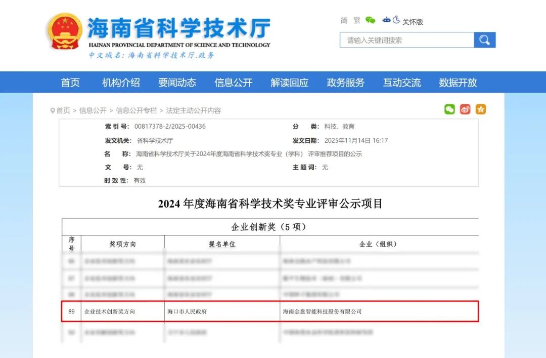近日,2024年度海南省科学技术奖专业评审完成公示,海南金盘智能科技股份有限公司(以下简称“ 金盘科技 ”)成功斩获“海南省企业创新奖”(企业技术创新奖方向)。这一荣誉,不仅是对该企业科技创新的高度肯定,更彰显了其在数字化、智能化、绿色化、低碳化转型中取得的显著成果。