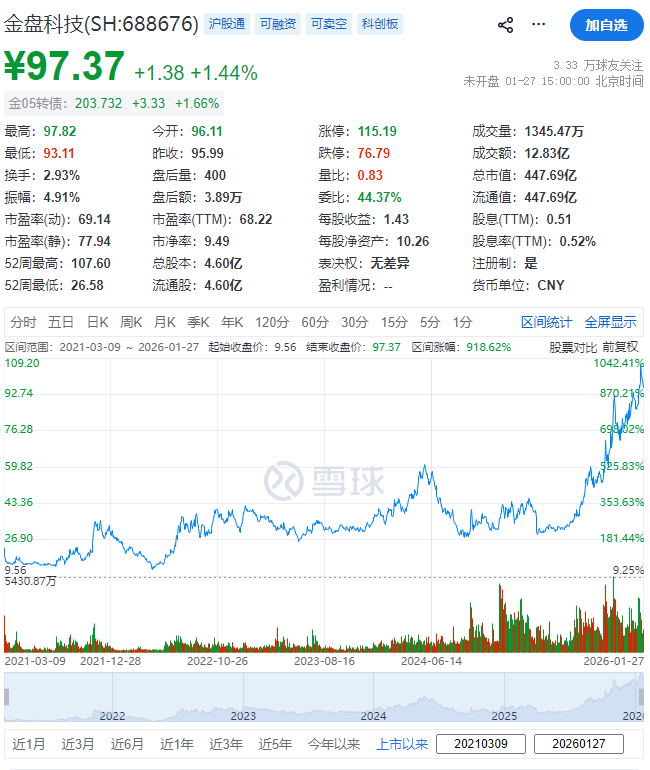 金盘科技(688676.SH)于2021年3月9日在上交所上市,截至周二(1月27日)收市,其总市值约447.69亿元人民币。