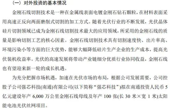 为充分把握市场机遇,加速在光伏市场的布局,根据公司发展需要,公司控股子公司强芯科技(南通)有限公司(以下简称“强芯科技”)拟在南通投资人民币5亿元建设年产6,000万公里金刚石线母线及年产100张(长30米×宽1米)太阳能电池光伏丝网项目。