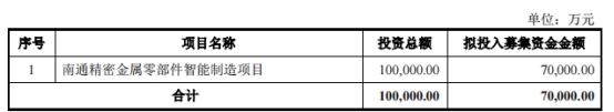 公司本次向不特定对象发行可转换公司债券的募集资金总额不超过70,000.00万元(含70,000.00万元),扣除发行费用后的募集资金净额将用于投入以下项目:南通精密金属零部件智能制造项目。
