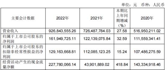 福立旺2022年年度报告显示,2022年度,公司实现营业收入9.27亿元,同比增长27.58%;归属于上市公司股东的净利润1.62亿元,同比增长32.59%;归属于上市公司股东的扣除非经常性损益的净利润1.29亿元,同比增长15.24%;经营活动产生的现金流量净额2.28亿元,同比增长418.84%。