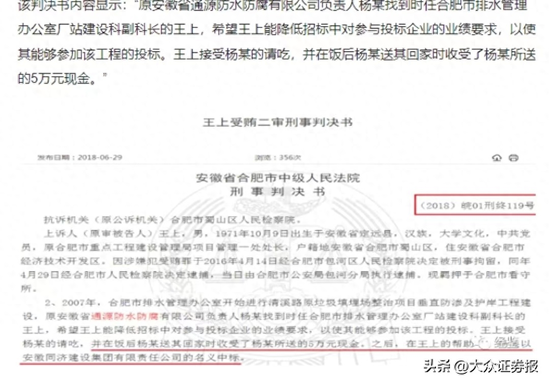 此外,曾有媒体报道,案号为(2018)皖01刑终119号的裁判文书显示,2007年原安徽省通源防水防腐有限公司(通源环境的前身)负责人杨某向时任合肥市排水管理办公室厂站建设科副科长的王某行贿5万元人民币。但本报记者搜索相关判决书时,却并未找到相关记录。判决书就这么“消失了”。