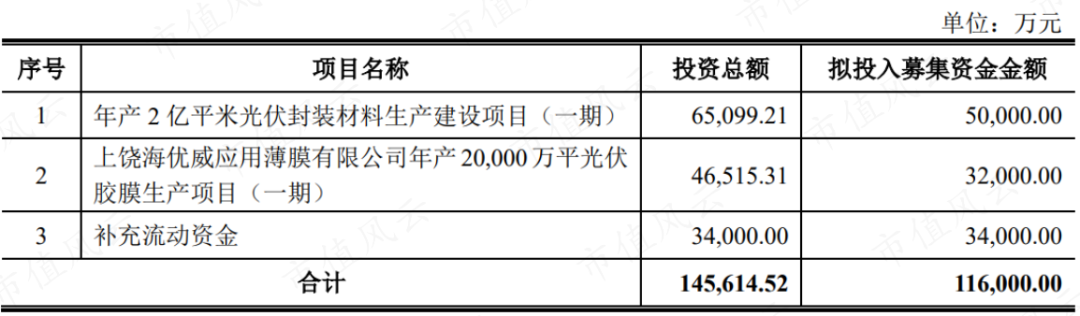 9月,海优新材又出台了11.6亿的定增预案。其中5个亿用于“年产2亿平米光伏封装材料生产建设项目(一期)”,3.2个亿用于上饶年产2亿平光伏胶膜生产项目,3.4亿用于补充流动资金。