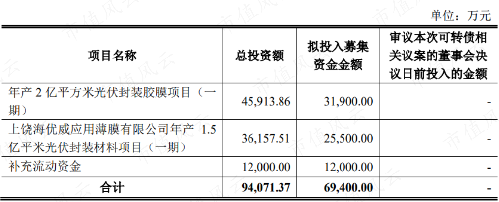 然而上市后仅仅一年半,公司就发行可转债募集资金6.94亿元,其中3.19亿用于“年产2亿平方米光伏封装胶膜项目(一期)”,2.55亿用于上饶年产1.5亿平米光伏封装材料项目,1.2亿用于补充流动资金。