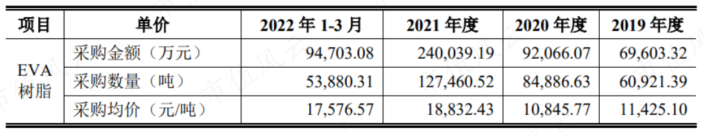 由于EVA树脂的产能扩张较慢,在下游需求快速增长叠加油价回升的情况下,2021年公司EVA树脂采购价飙升74%至1.88万元/吨。