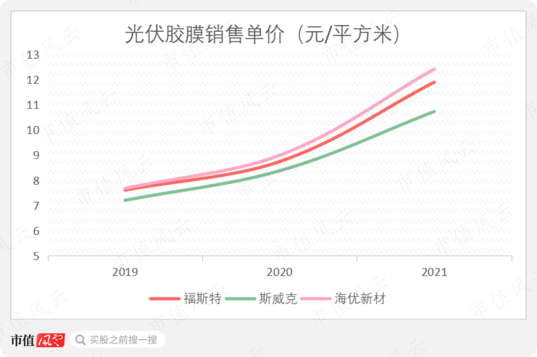 因此销售单价差别也不大。福斯特和海优新材去年光伏胶膜销售单价分别为11.9、12.4元/平方米,海优新材的产品还要更贵一些。