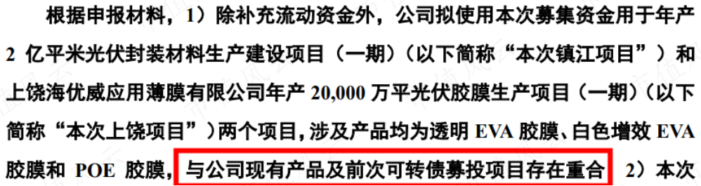 截至目前,“年产2亿平方米光伏封装胶膜项目(一期)”的实施地由江苏盐城变更为浙江嘉兴,上饶项目则是在正常实施中,预计2年内投产。