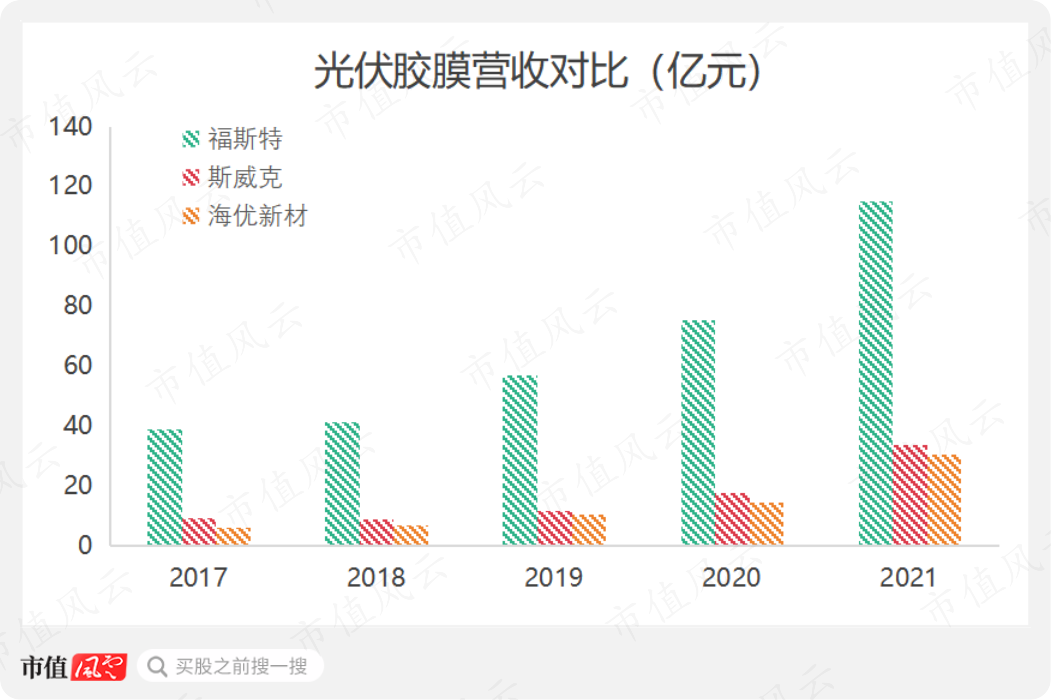 最近5年,福斯特、斯威克、海优新材的光伏胶膜营收复合年化增速分别为31.2%、38.2%、49.0%,经历了一段高速增长期。去年三家公司光伏胶膜营收分别为115.1亿、33.8亿、30.5亿。