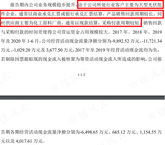 海优新材现金流长期净流出的主要原因是产业链地位很弱鸡:公司对下游客户通常以票据结算,回款周期较长;对上游供应商则采用现款结算,付款周期较短。