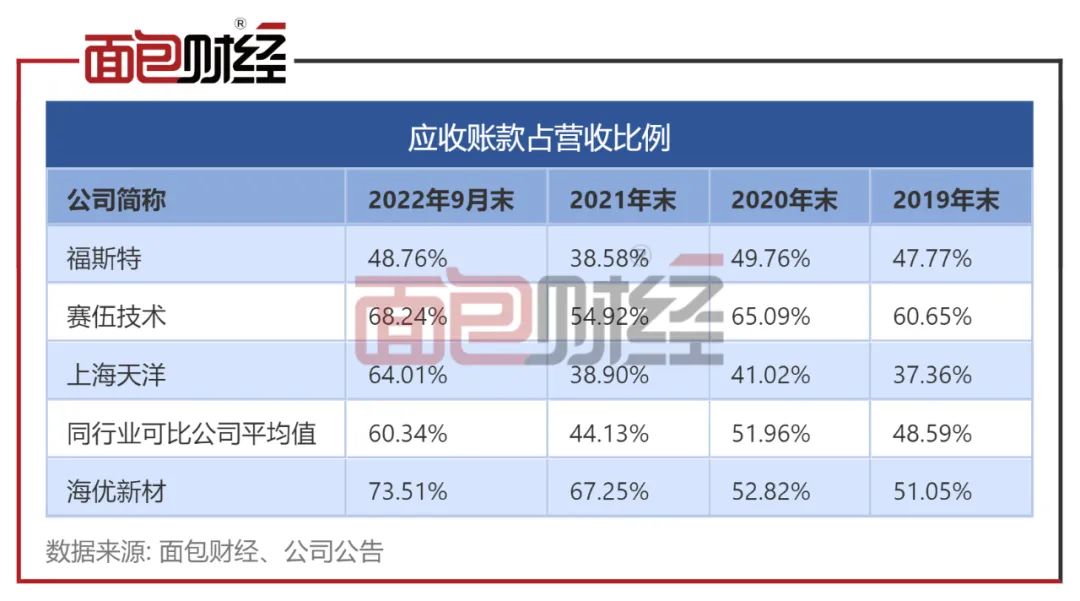 数据显示,2019年至2021年,海优新材应收账款占营收的比例由51.05%增长至67.25%,逐年升高。截至2022年9月末,公司应收账款占营收比例已达73.51%,与同行业可比公司平均值60.34%相比,高出13.17个百分点。
