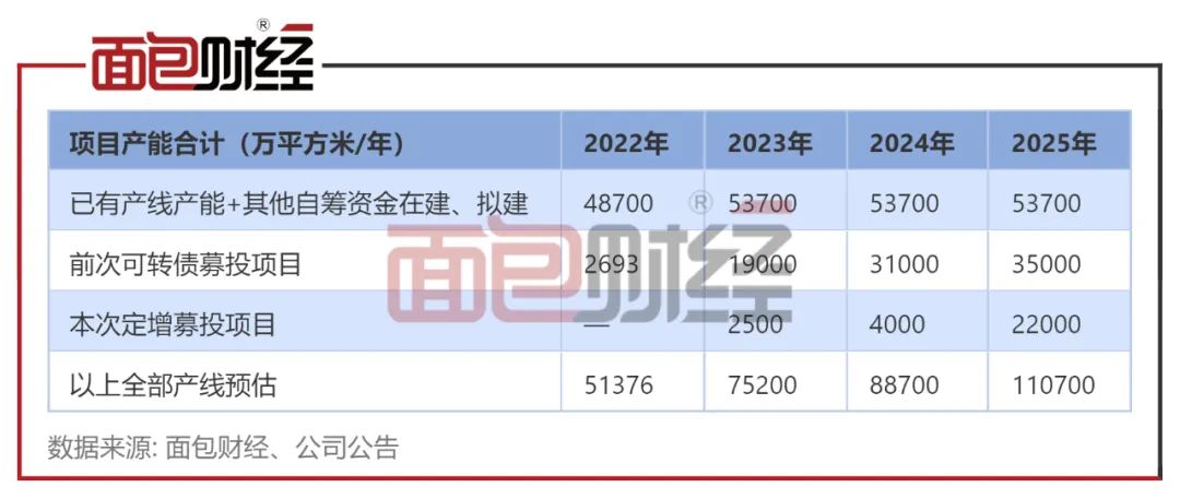 产能方面,公告显示,2022年公司现已有产能预计有5.14亿平方米/年,而2022年产能利用率仅87%。若此次定增未能实施的话,2025年产能预计有8.87亿平方米/年;若此次定增顺利实施的话,2025年产能预计有11.07亿平方米/年。而监管部门也重点问询了公司是否具有2年后至11.07亿平方米/年的产能消化能力。